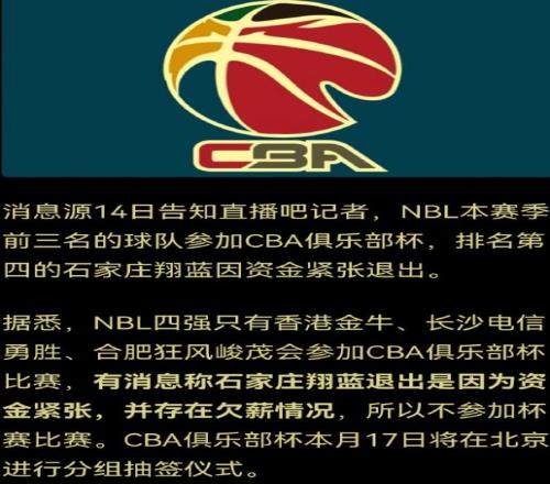 CBA第二届俱乐部杯定于11月17日进行分组抽签仪式,为了为下一步的CBA联赛扩军和恢复升降级试水,所以这一届的俱乐部杯不再仅限于20支CBA球队参加比赛,而是进行扩军,新增NBL四强球队香港金牛男篮、长沙勇胜男篮、合肥狂风男篮和石家庄翔蓝男篮。但是,谁也没有料到,这种主动送上门的绝佳机会,石家庄翔蓝男篮竟然因为资金紧张而主动选择退出,算是变相拒绝参加。
