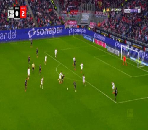 接到拉斐尔·格雷罗在禁区边缘的传球后,卡尔冷静转身,左脚外脚背兜射,皮球划出一道完美的弧线,直挂球门远角死角,门兴门将莫里茨·尼古拉斯毫无反应。3比0,拜仁彻底锁定胜局。