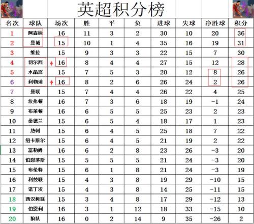 积分榜方面,阿森纳惊险绝杀赢球后,先赛的他们暂时将和曼城的分差拉大到5分。切尔西和利物浦今天齐齐赢球,切尔西暂时超过水晶宫冲回前4,利物浦则是超过曼联1分升至第6。