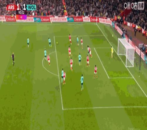 第89分钟分钟,狼队右路压上,戈麦斯禁区前沿策应兜传转移到左侧,查切阿禁区内抢点头球摆渡顶出来,马内禁区左侧前沿将球卸下,转身稍作调整大力兜射,阿罗科达雷小禁区前沿抢点头槌一顶,皮球应声入网,狼队1:1扳平比分。这个时间段很可能是一个绝平球,但阿森纳也不想在副班长身上丢分,最后几分钟他们展开猛烈攻势,第93分钟,阿森纳右路压上,萨卡禁区边上拿球晃开防守兜传门前,在热苏斯抢点干扰的情况下,莫斯克拉一记漂亮的“甩头攻门”将球送入自家网窝,阿森纳2:1压哨绝杀狼队。阿森纳今天射门13:2完全压倒狼队,但最终却只能依靠2个乌龙球,惊险绝杀狼队拿到3分。