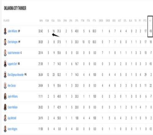 杰威在场-18雷霆最差,多尔特7中1(在场-10),亚历山大在场+2,霍姆格伦8中3(在场+18),杰威才是先发之中在场表现最差的那个。