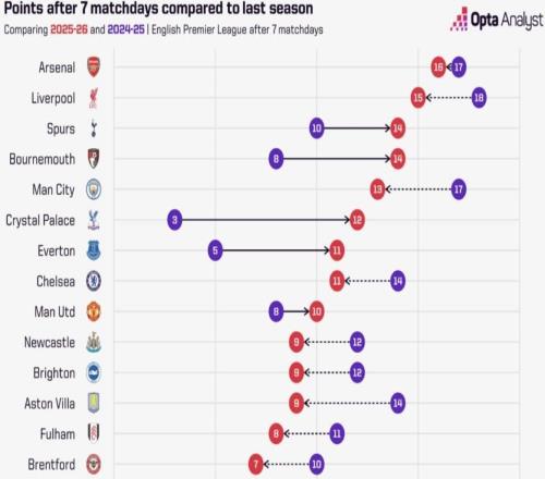 Opta列出了本赛季英超球队与上赛季前7轮过后的积分对比,阿森纳少拿了1分,利物浦少拿了3分,水晶宫多拿了9分进步最大,曼联则多拿了2分。本赛季英超球队与上赛季英超同期积分对比(